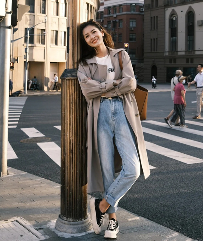 风衣+帆布鞋,最常见搭配的下装就是牛仔裤。这样,整套造型既有中性单品的利落、经典单品的简约、随性单品的休闲气息,将新时代女人不受拘束、尽情突出个人魅力的氛围感淋漓尽致的展现出来。只将上身的T恤下摆塞进牛仔裤里面,就轻松让造型的随性与利落气息突出。