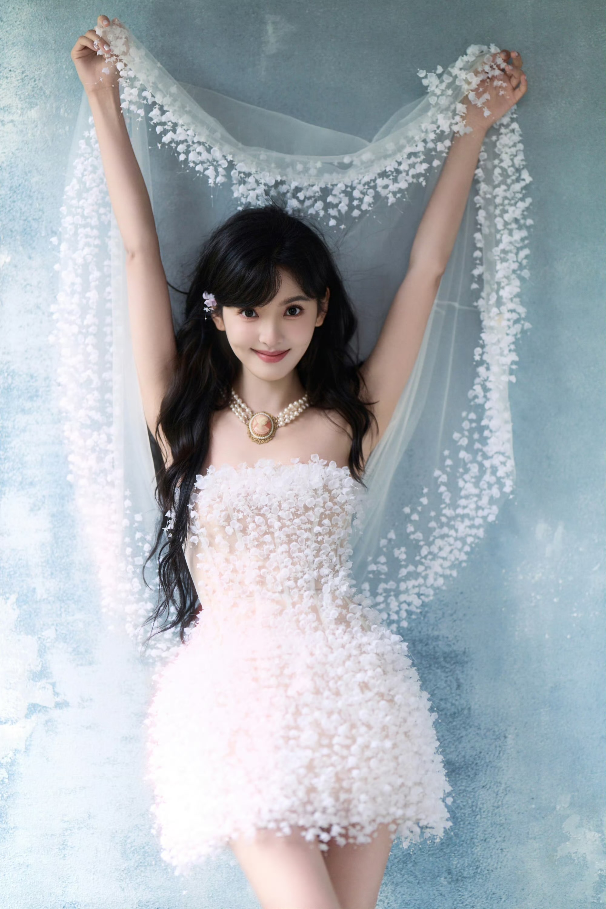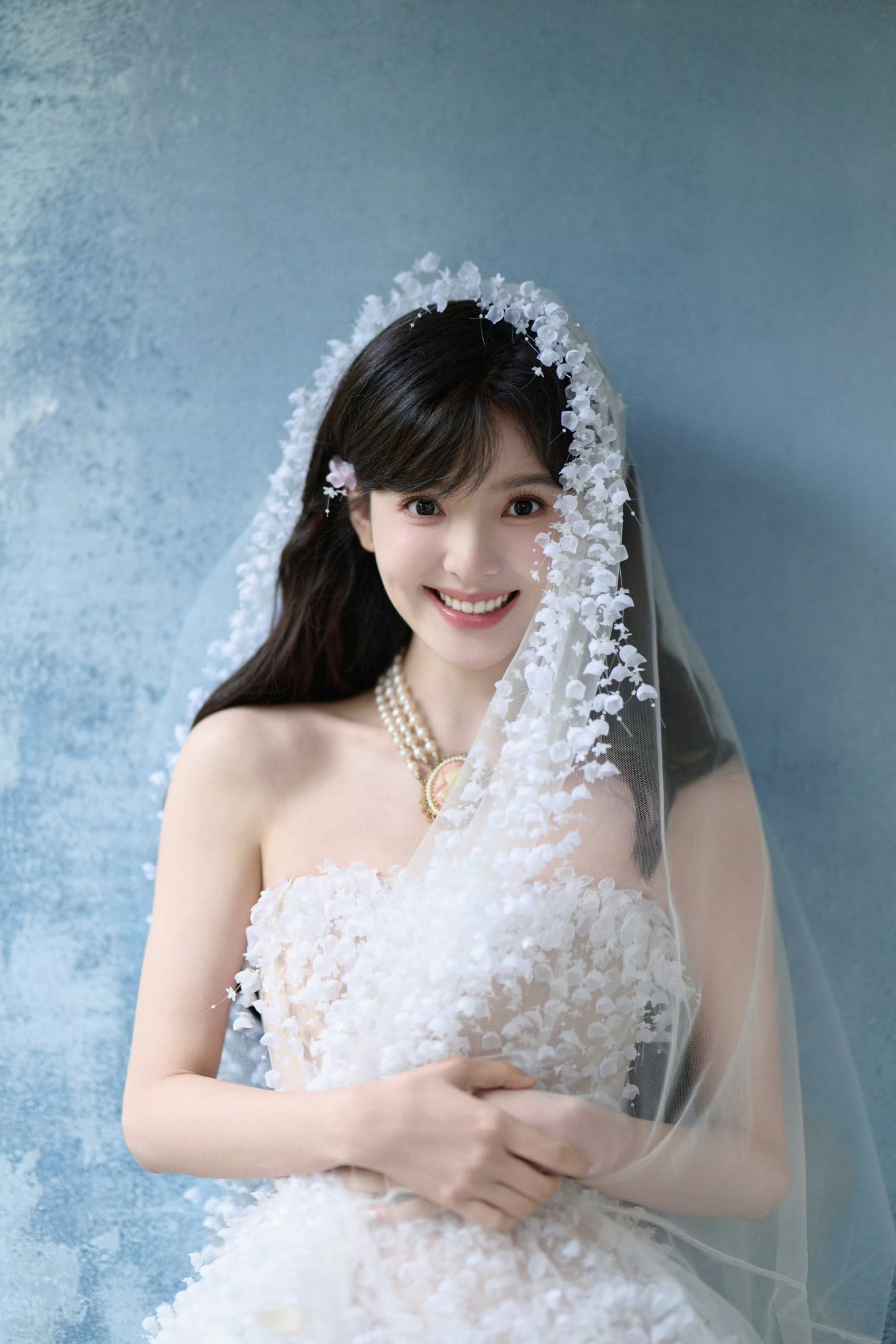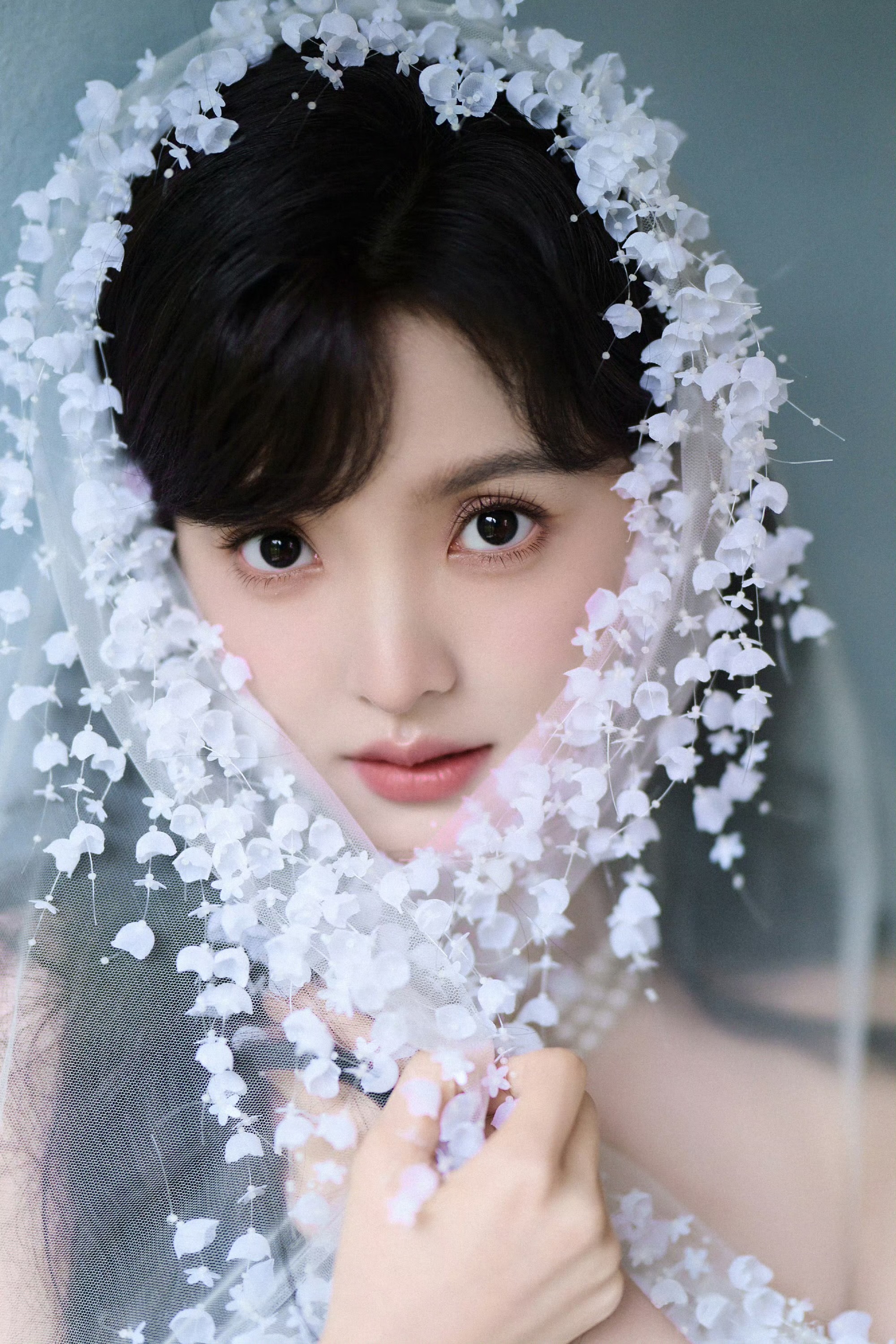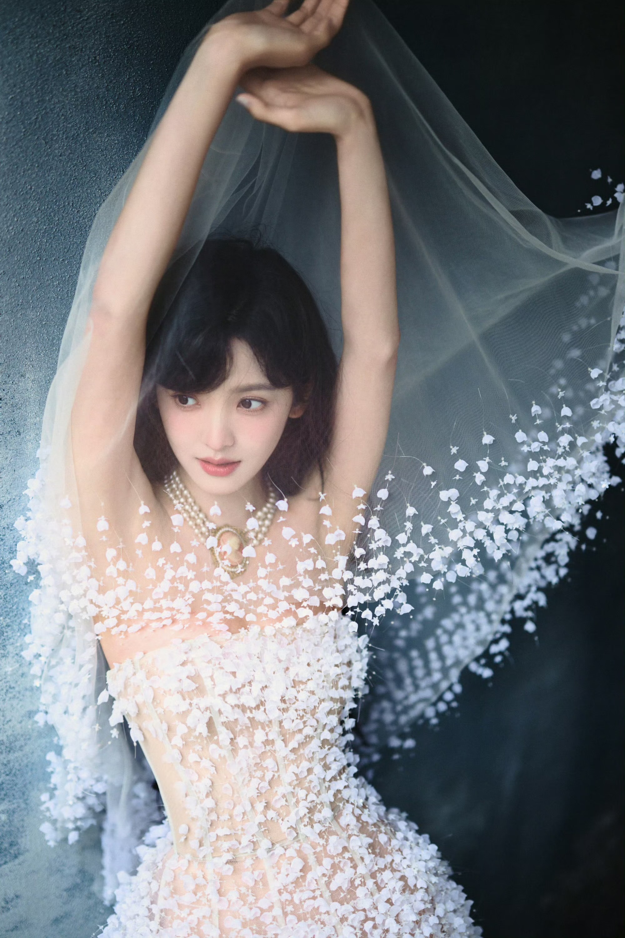 纯白裙摆轻轻扫过章若楠,薄纱似雾光笼罩,轻盈梦幻。每一张照片都让人怦然心动
