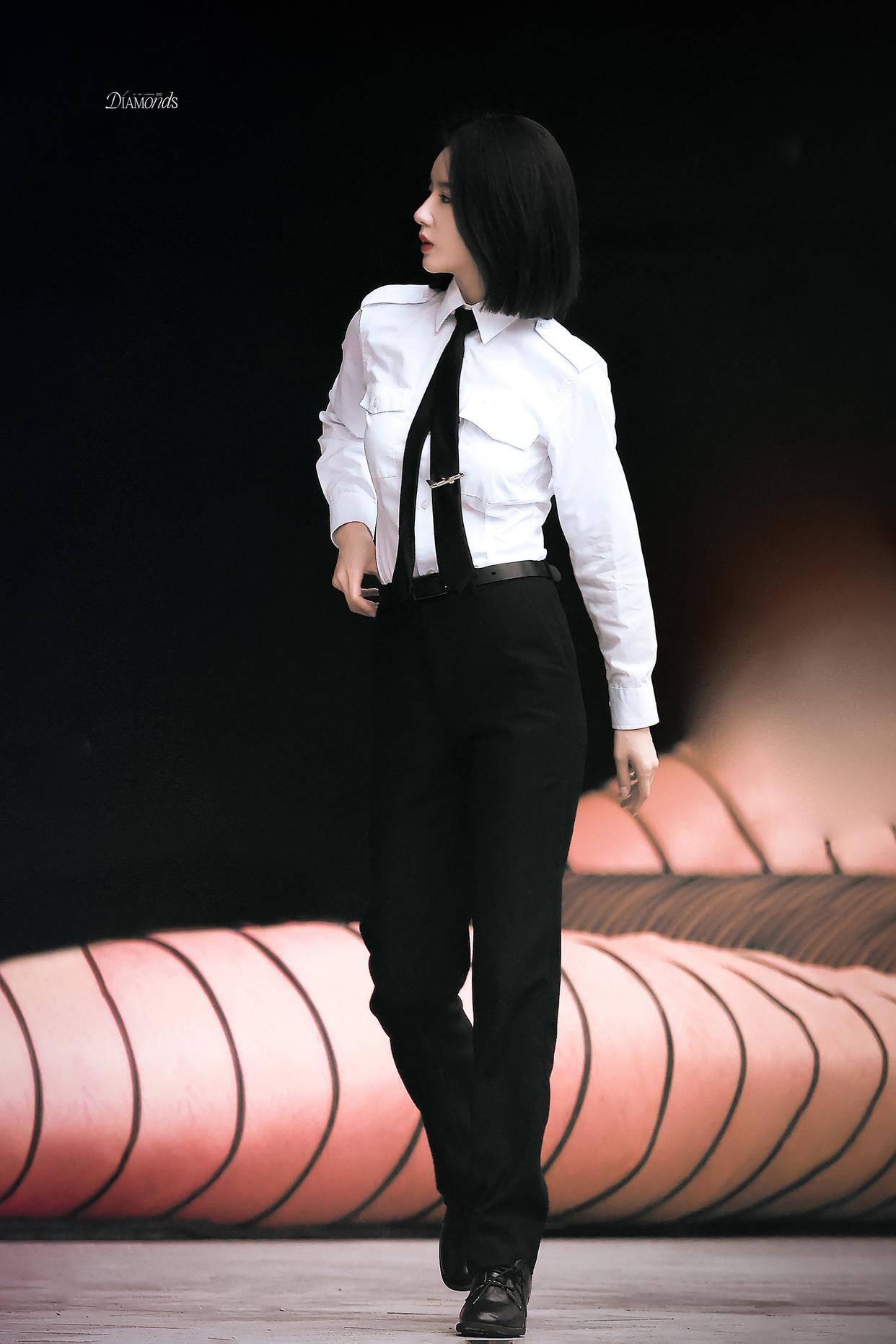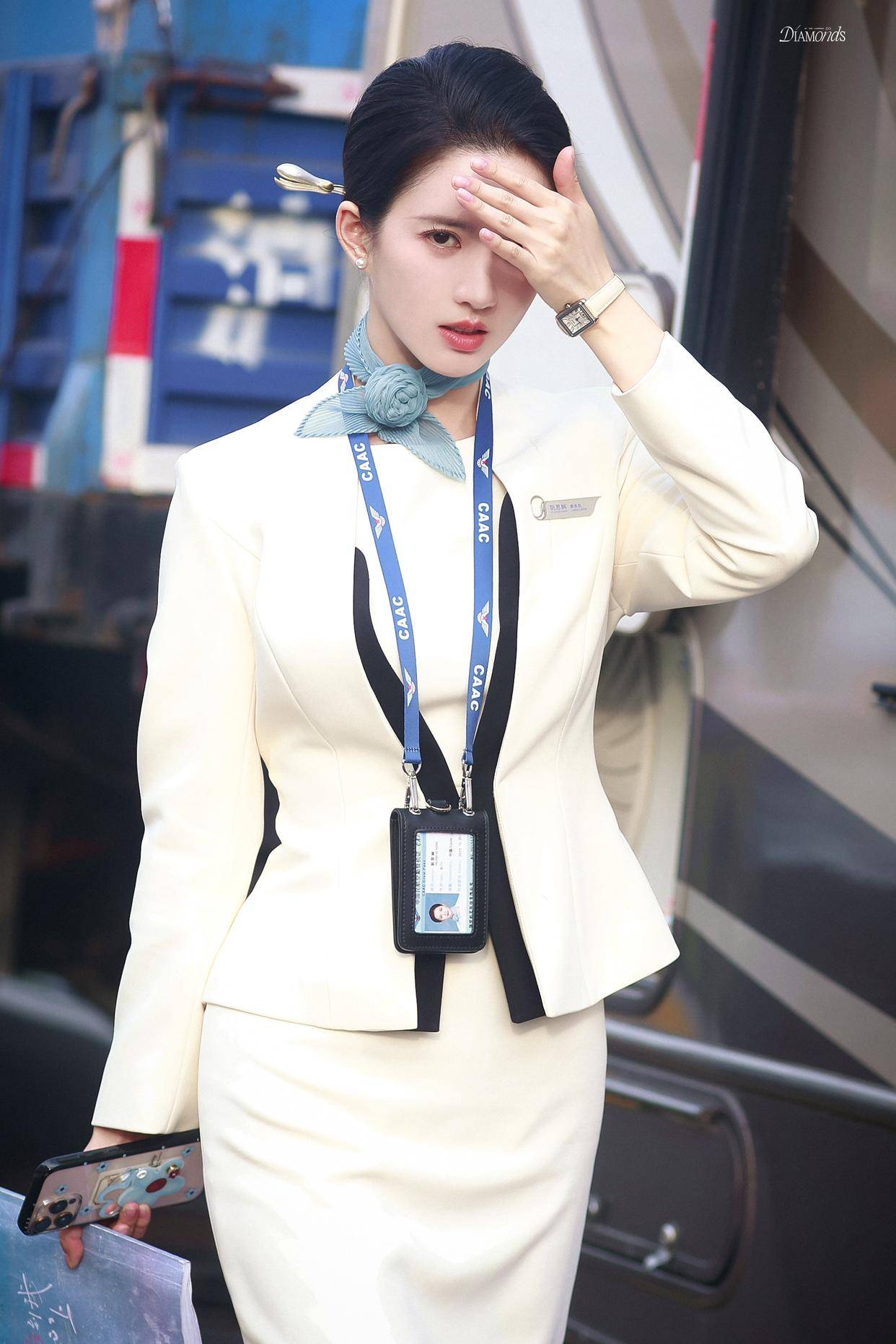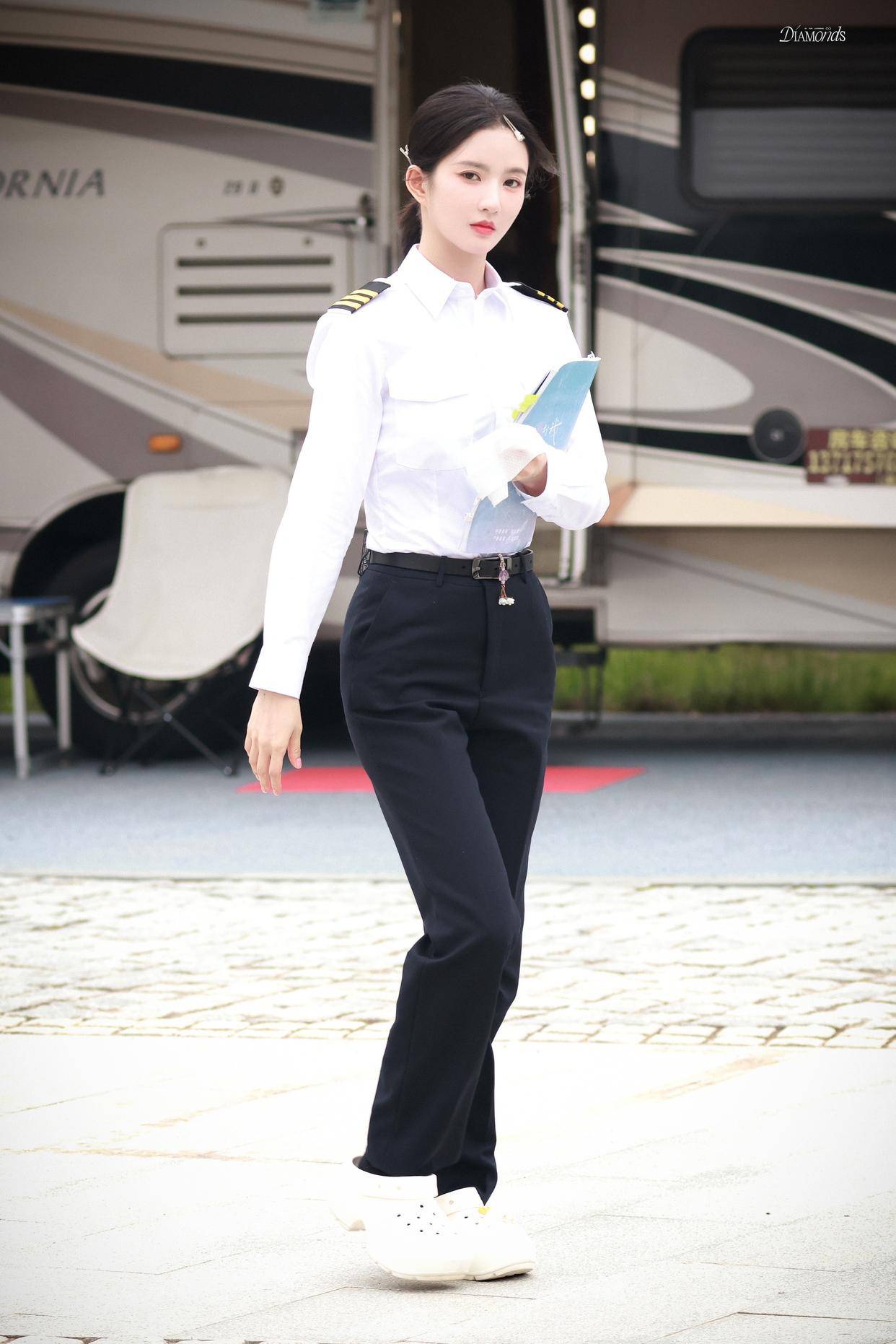 当她穿上飞行员制服时,风格瞬间转变为飒爽干练。白色衬衫搭配黑色长裤,简单的搭配却因她的身材显得格外有气场,笔直的双腿在裤装的修饰下显得更加修长,每一步都充满了自信。这种风格的反差,让我们看到了她在时尚穿搭上的可塑性,无论是优雅还是飒爽,她都能完美演绎。